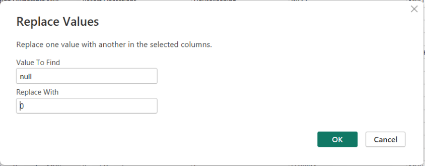 To replace NULLs, first select the column where the NULL values exist. Then choose Replace Values. When the dialog box appears, enter null as the value to find and replace, and specify the value you want to use instead—such as 0 for numeric columns or “Unknown” for text columns.
