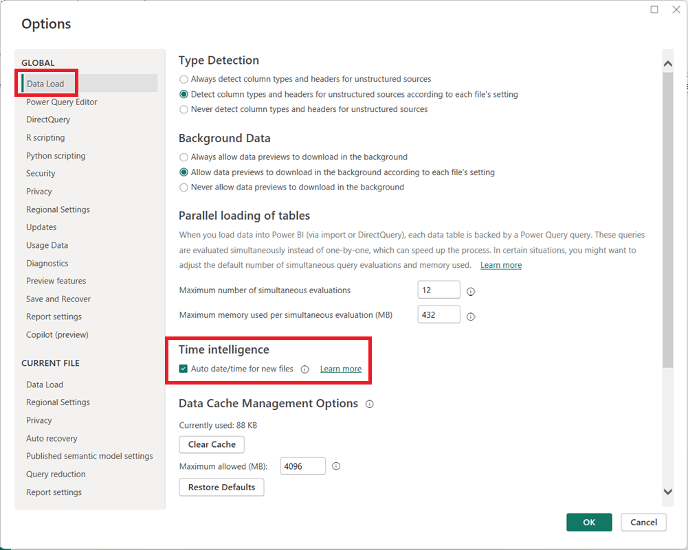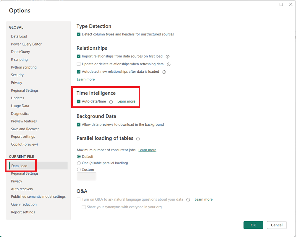 - (Optional but recommended) Under Current File, select Data Load and uncheck Auto date/time to disable it for the current report.
