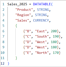 The above table (Sales_2025) was created using the following DAX code utilizing the DATATABLE function (or you could enter the data directly using the Enter Data feature in Power BI):